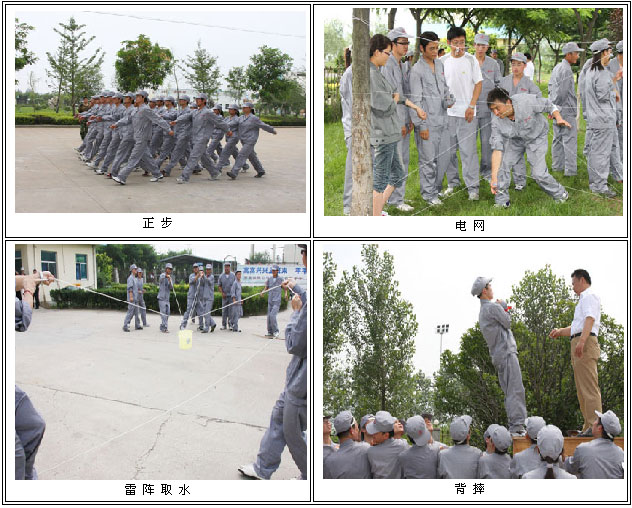 中復(fù)連眾軍事訓(xùn)練在傳統(tǒng)軍訓(xùn)內(nèi)容的基礎(chǔ)上,還融入了背摔、電網(wǎng)、雷陣取水、盲陣等拓展訓(xùn)練的項(xiàng)目。這些拓展項(xiàng)目一方面豐富了軍訓(xùn)貧乏、單調(diào)的內(nèi)容,另一方面加深了新員工之間的相互了解,增強(qiáng)他們的團(tuán)隊(duì)精神和合作意識(shí),通過(guò)復(fù)雜而艱巨的拓展項(xiàng)目,員工們之信任、理解、默契與日俱增,這為他們以后出色的完成工作任務(wù)打下了堅(jiān)實(shí)的基礎(chǔ)。