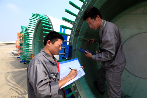 目前中復(fù)連眾生產(chǎn)的葉片最短的有34米,最長(zhǎng)的達(dá)到超過60米,這就造成擺放這些葉片的場(chǎng)地非常大,連云港生產(chǎn)基地的貨場(chǎng)大約300畝。廣闊的貨場(chǎng)繞行一周至少需要半個(gè)小時(shí),工作內(nèi)容暫且不說,光是每天在貨場(chǎng)上來(lái)回走上幾趟,很多人都吃不消,加上酷暑寒冬,風(fēng)吹雨淋,讓人望而生畏。葉片噴漆完畢到等待發(fā)貨這段時(shí)間,賈效博會(huì)將對(duì)葉片進(jìn)行航空標(biāo)識(shí)、內(nèi)部檢查、后緣厚度、螺栓、葉片翼型檢查、人孔板等14個(gè)大類60多小項(xiàng)的檢查,從根部到尖部,從外表面到葉片內(nèi)里,有的需要肉眼觀察,有的需要儀器測(cè)量,需要嚴(yán)格對(duì)照工藝要求,逐項(xiàng)檢查,對(duì)檢查到的不合格項(xiàng)還要反饋給相關(guān)部門,請(qǐng)他們處理,然后再進(jìn)行一輪檢查,直至符合出廠標(biāo)準(zhǔn)。遇到發(fā)貨時(shí)間比較急,或者是出口訂單,他的任務(wù)就更艱巨了,加班加點(diǎn)不說,對(duì)同一只葉片他要看好幾次,確認(rèn)沒有問題了,他才會(huì)給客戶監(jiān)理看。