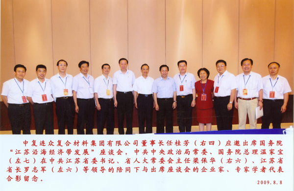 8月8日,中共中央政治局常委、國(guó)務(wù)院總理溫家寶在江蘇考察調(diào)研,并召開(kāi)國(guó)務(wù)院“江蘇沿海經(jīng)濟(jì)帶發(fā)展”座談會(huì),就江蘇沿海地區(qū)的經(jīng)濟(jì)發(fā)展廣泛聽(tīng)取了連云港、鹽城、南通部分重點(diǎn)企業(yè)負(fù)責(zé)人和專家的意見(jiàn)。中國(guó)復(fù)合材料集團(tuán)有限公司副總經(jīng)理、連云港中復(fù)連眾復(fù)合材料集團(tuán)有限公司董事長(zhǎng)任桂芳作為重點(diǎn)企業(yè)家代表應(yīng)邀出席,并合影留念。
