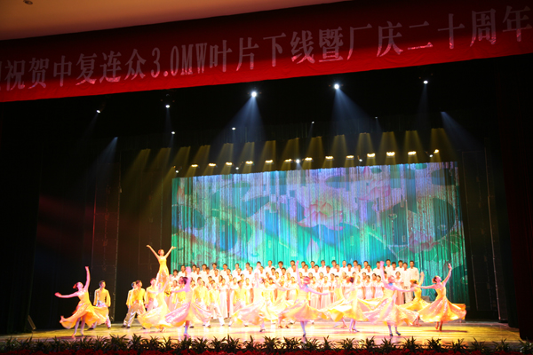 國家發(fā)改委能源研究所副所長李俊峰,中國可再生能源學(xué)會風(fēng)能專業(yè)委員會秘書長秦海巖,中國農(nóng)機(jī)協(xié)會風(fēng)力機(jī)械分會秘書長祁和生,中國建材雜志社秦春雨,來自沈陽、酒泉和包頭的地方領(lǐng)導(dǎo),中國建材集團(tuán)及其下屬企業(yè)的領(lǐng)導(dǎo),以及包括上海電氣、東方汽輪機(jī)公司、湘電風(fēng)能等在內(nèi)的中復(fù)連眾國內(nèi)外合作伙伴及客戶、員工等歡聚一堂。南京軍區(qū)前線文工團(tuán)為中復(fù)連眾20周年慶典獻(xiàn)上了精彩文藝節(jié)目,共?!爸袕?fù)連眾輝煌20年”。慶典在中復(fù)連眾數(shù)百名員工的合唱中“風(fēng)啊風(fēng),吹啊吹,我的翅膀跟著飛……”推向了高潮。