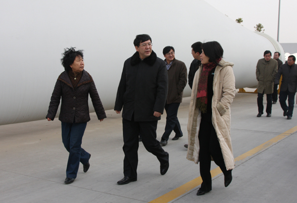 參觀期間,陰和俊一行興致勃勃的來到葉片堆場和四分廠生產(chǎn)車間,詳細(xì)了解了葉片生產(chǎn)工藝、原材料采購、葉片檢測等情況。今年10月,中復(fù)連眾重點投資建設(shè)的總面積3100平方米的葉片檢測中心正式啟用。該檢測中心主要針對風(fēng)機葉片性能進(jìn)行全面檢測,檢測項目包括葉片靜力試驗、疲勞試驗、固有頻率測量、阻尼測量、剛度分布測量、葉根連接結(jié)構(gòu)靜強度等試驗。