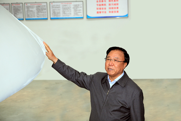 隨后,陸浩、徐守盛等各位領導和嘉賓相繼視察了包括中復、華銳、金風科技的幾個酒泉產(chǎn)業(yè)化基地的風電企業(yè)。在來到中國復材3兆瓦的葉片車間之后,陸浩認真聽取了張定金的介紹匯報,當看到中復生產(chǎn)的3兆瓦葉片時非常高興,并與其他領導和嘉賓一起出席中復3.0MW風力機葉片的投產(chǎn)儀式,中國復材副總經(jīng)理、中復連眾集團董事長任桂芳、總經(jīng)理喬光輝陪同參觀。