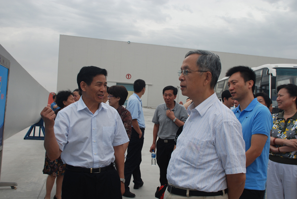 中復(fù)連眾集團(tuán)董事長(zhǎng)任桂芳向張人為、喬龍德、宋志平等一行匯報(bào)了近年來(lái)中復(fù)連眾在中國(guó)建材集團(tuán)、中國(guó)復(fù)材集團(tuán)的領(lǐng)導(dǎo)下取得飛速發(fā)展的情況。立足“大市場(chǎng)、大客戶(hù)、大訂單”,快速布局,已提前兩年完成年產(chǎn)萬(wàn)只風(fēng)機(jī)葉片戰(zhàn)略規(guī)劃;從技術(shù)引進(jìn)、集成創(chuàng)新,到自主創(chuàng)新,目前可以生產(chǎn)5個(gè)系列二十多個(gè)葉型風(fēng)機(jī)葉片。其中,酒泉葉片生產(chǎn)基地是中復(fù)連眾國(guó)內(nèi)三個(gè)外埠葉片生產(chǎn)基地中最大的一個(gè),占地413畝,目前已具備年產(chǎn)1500套兆瓦級(jí)風(fēng)力機(jī)葉片能力,可以制造1.5兆瓦到3兆瓦3個(gè)系列5個(gè)葉型風(fēng)機(jī)葉片。
