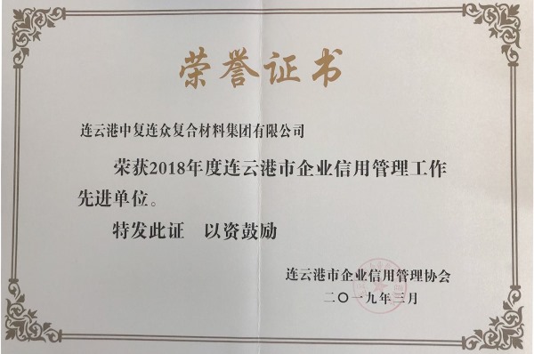 3月21日,連云港市企業(yè)信用管理協(xié)會(huì)對(duì)榮獲2018年度市級(jí)“信用管理先進(jìn)單位”進(jìn)行表彰并舉行授牌儀式,中復(fù)連眾榜上有名。