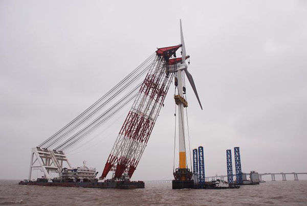 2010年2月27日15時28分,隨著最后一臺風(fēng)機(jī)與海上基礎(chǔ)承臺對接,我國首座、也是亞洲首座大型海上風(fēng)電場一一東海大橋海上風(fēng)電場全部34臺風(fēng)機(jī)安裝取得圓滿成功。這標(biāo)志看我國海上風(fēng)力發(fā)電產(chǎn)業(yè)穩(wěn)穩(wěn)邁出了第一步并進(jìn)入了實戰(zhàn)階段。